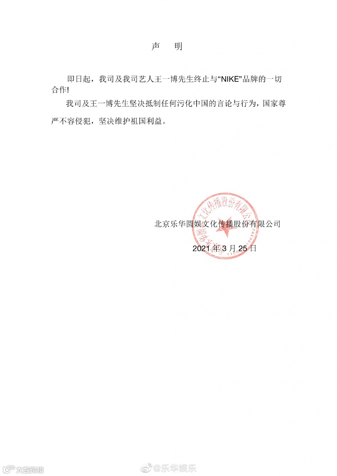 今日上午,明星王一博发布声明,终止与“NIKE”品牌的一切合作。