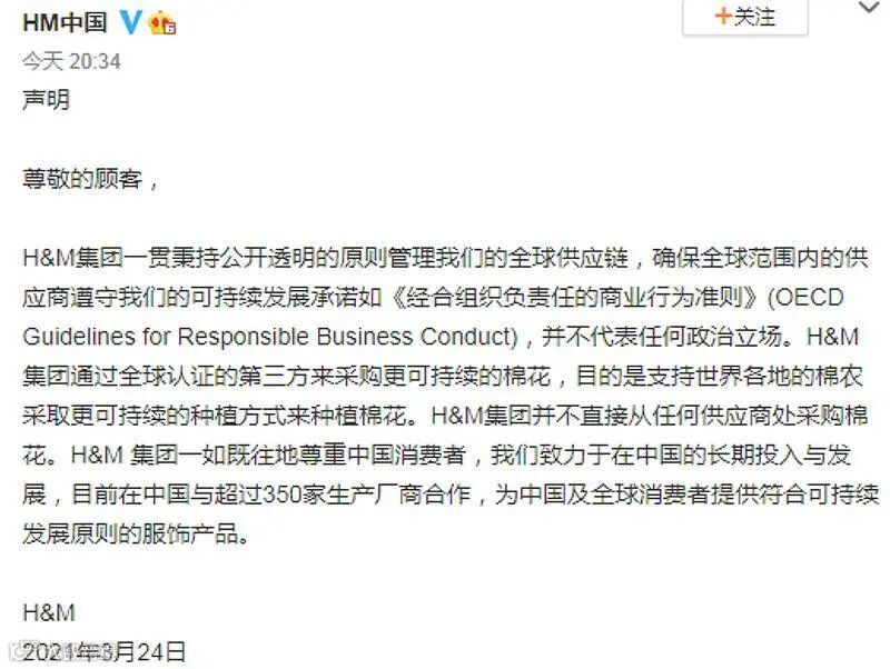 3月24日,H&M中国官方微博发布声明予以回应:H&M集团一贯秉持公开透明的原则管理全球供应链,确保全球范围内的供应商遵守我们的可持续发展承诺如《经合组织负责任的商业行为准则》(OECD Guidelines for Responsible Business Conduct),并不代表任何政治立场。