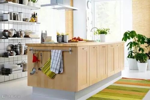 夏季在厨房内放入绿色植物,可起到视觉清凉的作用。绿萝、发财树、吊兰等植物不仅可以净化空气,且线条活泼、色彩明快,极富生机,为厨房增添了清凉和绿意。