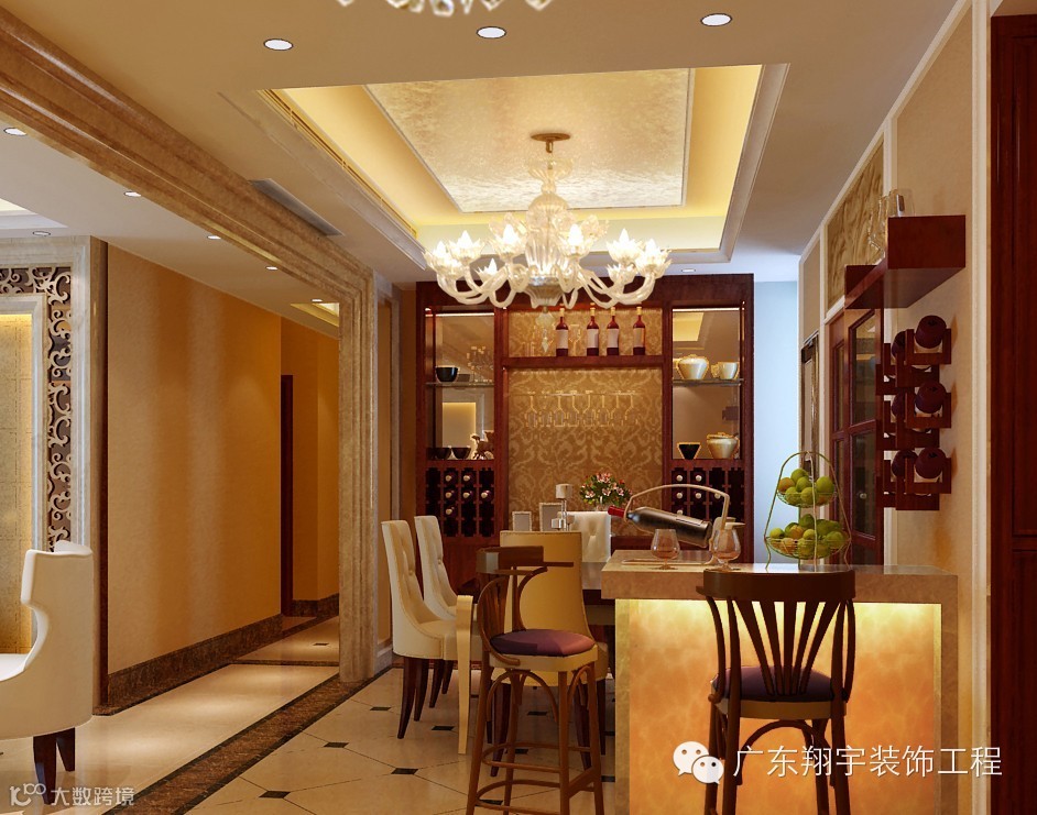 开放式的餐厅与客厅的格调高度统一,休闲吧台与高贵精美的餐桌,形成了整个空间的焦点,体现出主人对生活品味的追求。