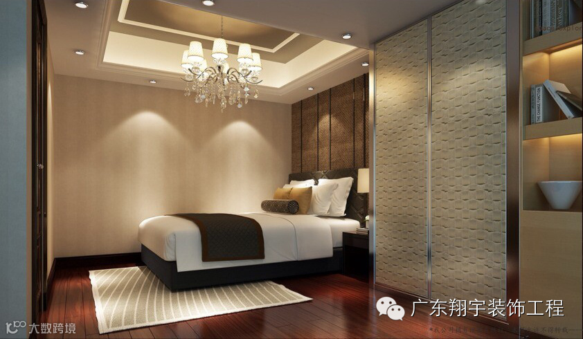 卧房:卧室选用欧式卡其色纹理图案作为主打色,床头背景以棕色布板造型、顶棚装饰辅以金箔,在灯光的衬托下,辉映出华丽的氛围。