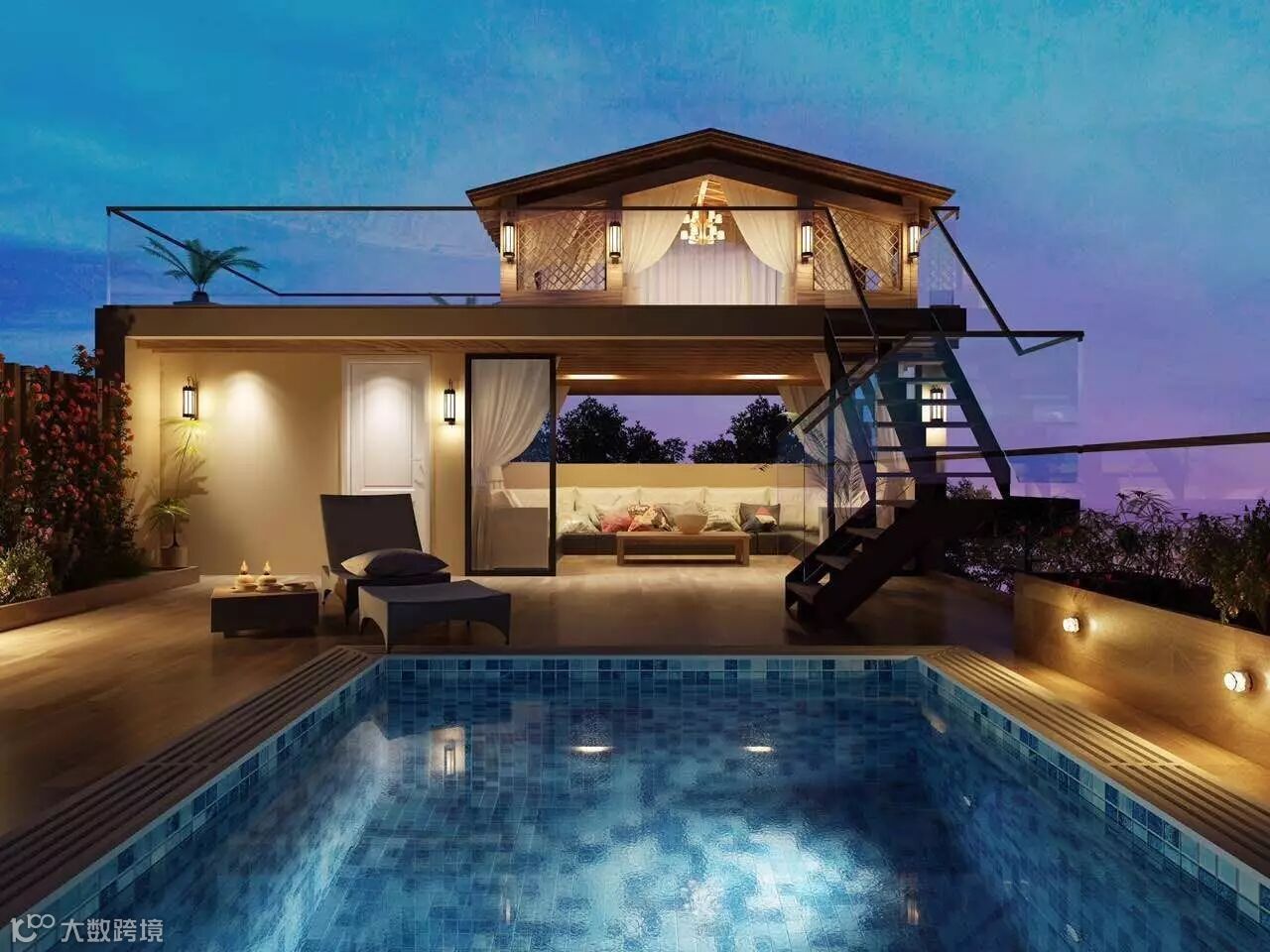 方案过程:原户型为三房两厅,外加一个带泳池的大阳台,原空间结构并没有满足业主对开阔空间的向往,略显局促。充分考虑业主的需求之后,我们在舍弃一个卧室的基础上,把原卧室空间改成餐厅,原来比较狭长的厨房,根据业主的生活需求改成开放式厨房,再配一个西厨吧台与餐厅形成对应,使得厨房与餐厅空间形成一个整体,显得时尚大气,更具生活气息。同时也打通了客餐厅的空间限制,完全达到了业主对于自由开阔空间的需求,显示出业主对生活的态度和对自由的向往。