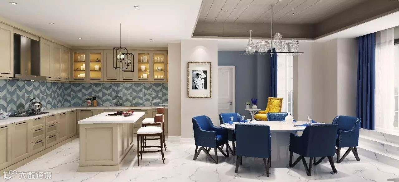 将明快的蓝色的色彩引入客厅、餐厅、厨房,不刻意、舒适而灵动,又增添一份时尚的气息。再搭配天花暖灰色的木地板,让空间和人的关系更加舒适、耐看,在这个理性的空间注入人文情怀,时尚与生活相结合,返璞归真得到真正的放松。