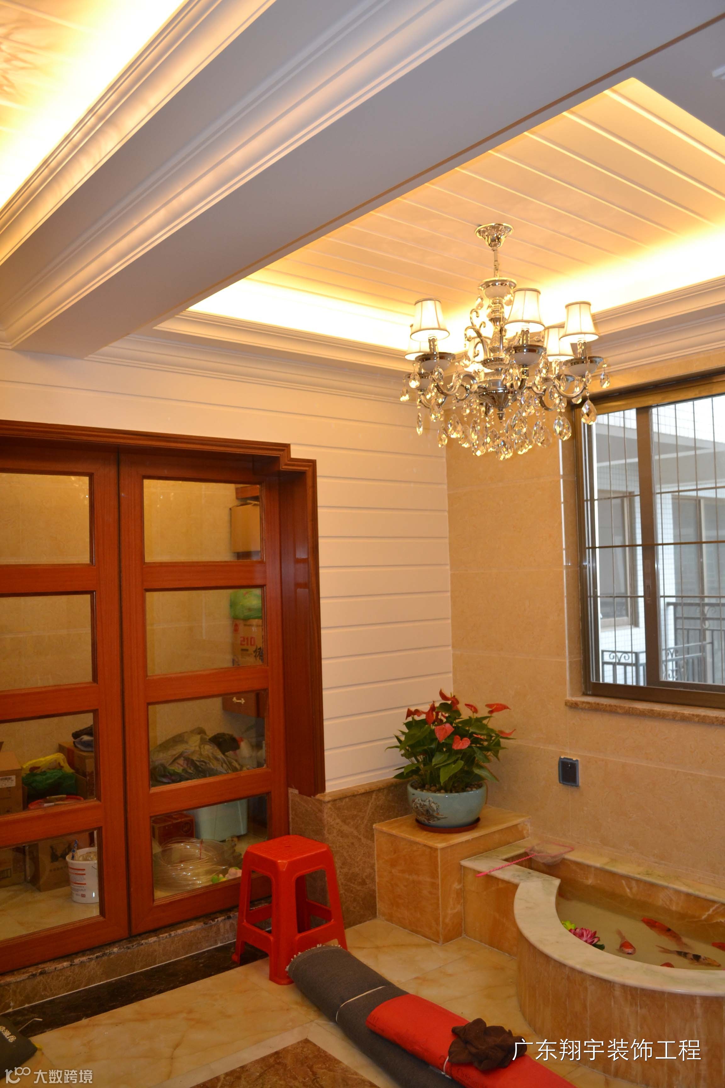 入户花园:入户花园有12个平方,不大不小,角落里还有几条很不美观的消防水管,所以设计师在入户花园隔了一半出来,做成踏踏米的储物间,再把水管藏在储物柜内。工程完成到最后,剩下不少的大理石余料,业主在跟设计探讨余料的运用时,最终想出了用名贵的松香黄大理石余料做成一个鱼池,不浪费余料的同时,又使入户花园增添了生气。