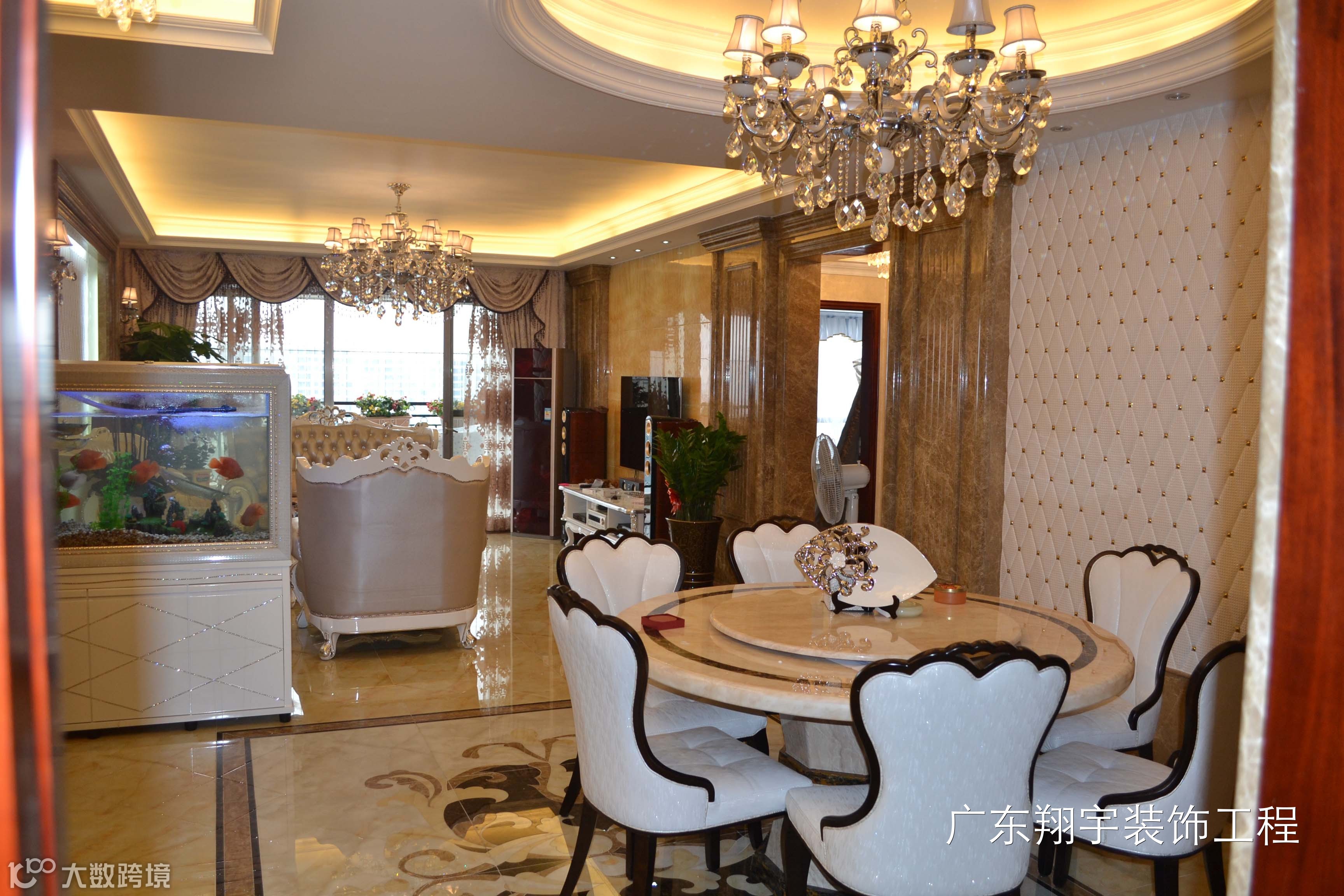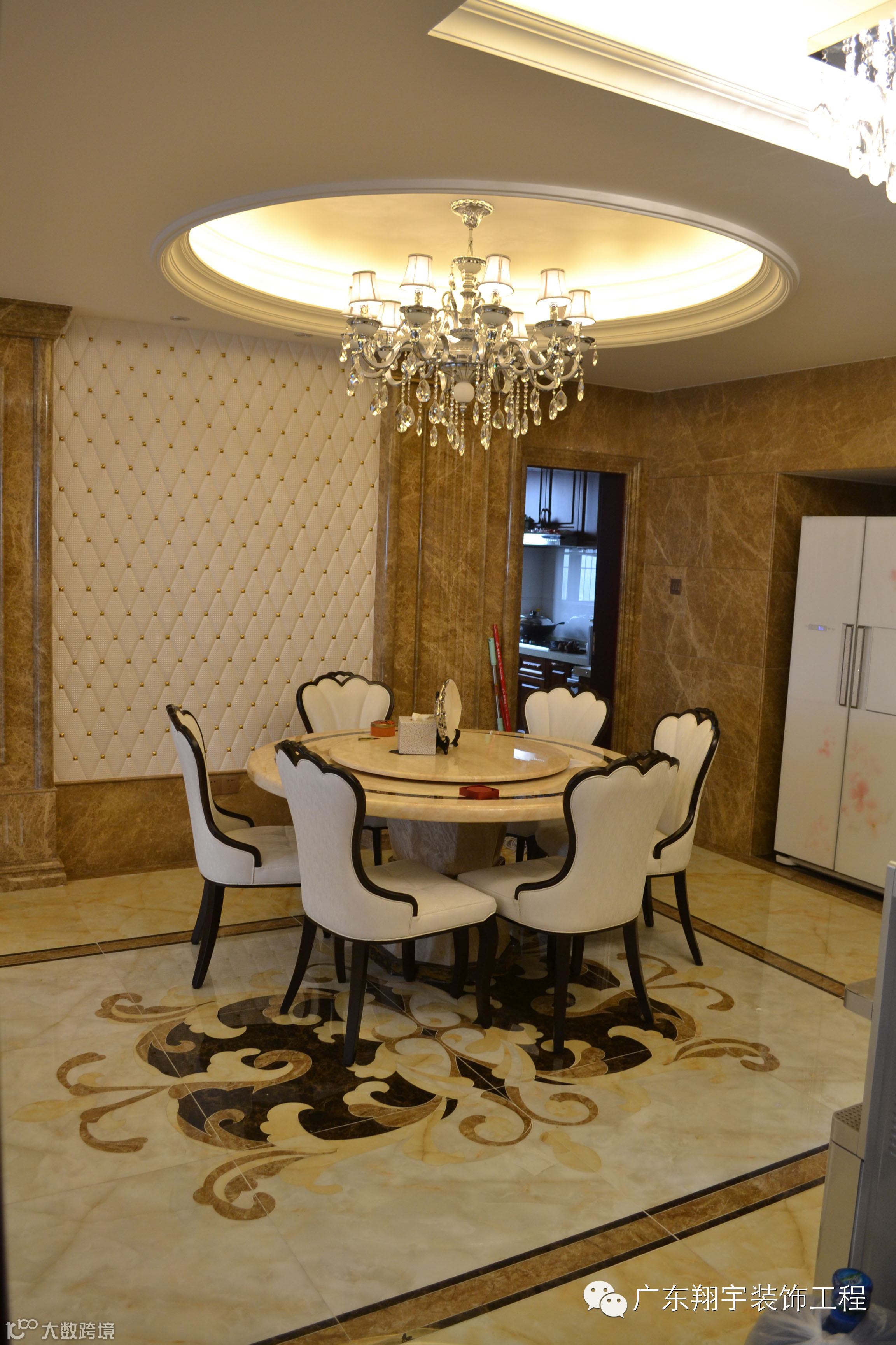 业主是一位30出头的皮具商人,喜欢欧式的高端大气,不喜欢色彩深沉和过于豪华。故色彩方面,设计师运用啡网大理石跟白色木器的深浅结合,使整个空间有着非常丰富的立体感。