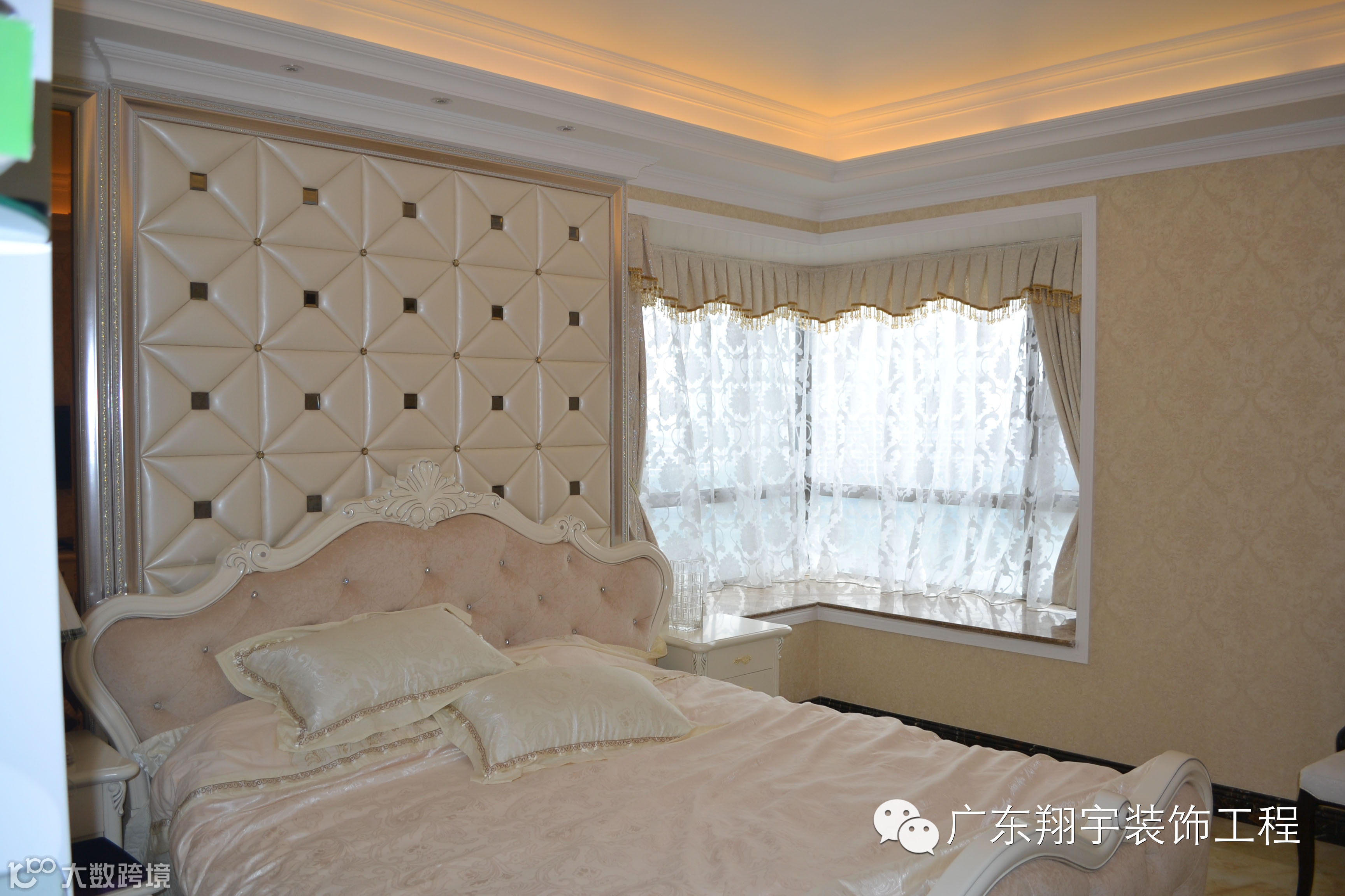 主人房:主人房墙面是米色的暗纹壁纸,床头背景是米色的真皮软包,凸窗的平行处采用茶镜跟油画框的巧妙搭配,使床头的凸窗不会显得过于凸兀。