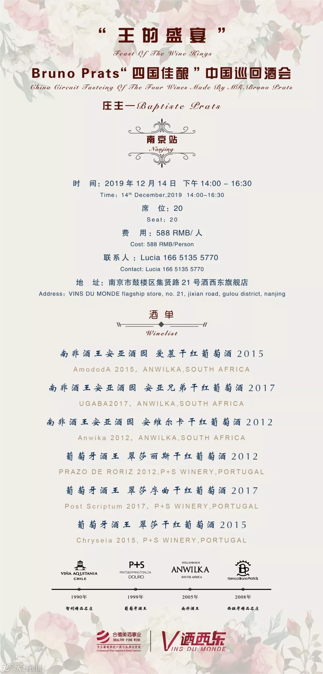 2019年度中国巡回酒会南京站BRUNO PRATS先生的孙子(同时也是四国佳酿品牌的全球推广大使)会亲临现场一起与我们品鉴佳酿,分享南非与葡萄牙独特的风土与酒庄故事...