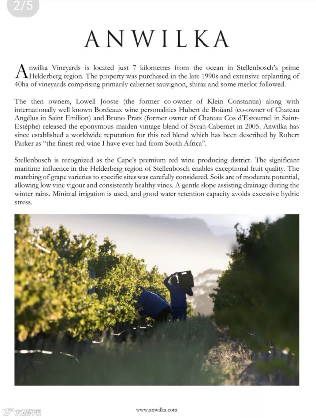 安亚酒园ANWILKA受益于金钟堡(Chateau Angelus)的所有者Hubert de Bouard先生和Lowell Jooste先生的专业知识。Jooste先生的家族带领着南非的克莱坦亚酒园(Klein Constantia)重新达到巅峰,并与Bruno Prats开始了这个项目。安亚酒园凭借其独特的安亚特酿-西拉与赤霞珠两个葡萄品种的混酿而在世界范围名声显赫。