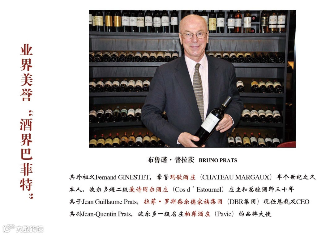 生于曾一度掌管玛歌酒庄的显赫豪门,本人也曾经是杰出的波尔多二级庄爱诗图尔(Cos d’Estournel)的庄主和酿酒师。执掌二十八载,一手将之打造成圣爱斯泰夫的酒王,成为最接近一级名庄的超二级酒庄(Super 2nd),在国际葡萄酒的舞台上拥有不可撼动的重要身份。后开创了全新的葡萄酒公司 Fidelis。如今公司拥有旗下四大作品(简称“BRUNO PRATS四国佳酿”)横跨欧洲、非洲和南美三大洲,包括: