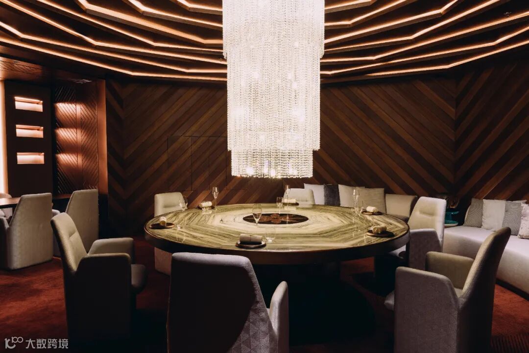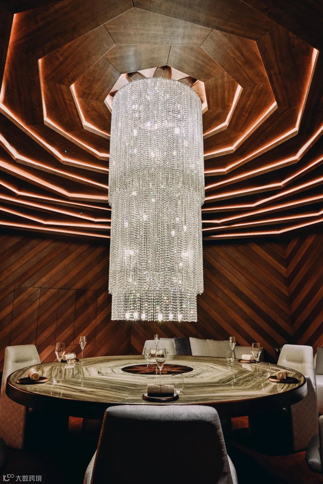 Anise遵循体验层级的深入设计布局,从吧台区域由浅入深直至PDR包房空间。PDR包房作为餐厅唯一的包间,可容纳8-10位客人用餐,是商务宴请、聚会、主题宴会的理想场所。包间整体的设计呈八角形,与餐厅的八角概念契合,黑棕色的色调沉稳踏实,定制的水晶灯悬于餐桌之上,宏伟大气,整个空间具有无限宽广之感。