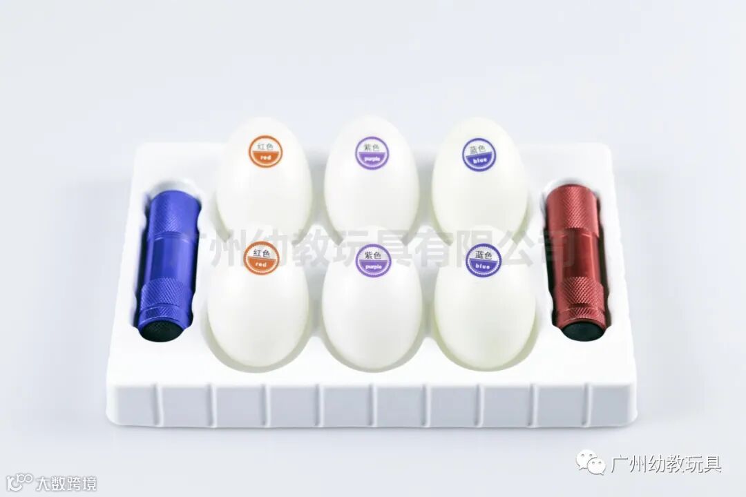 由6个感光变色彩蛋,2支安全紫外光电筒和存放彩蛋吸塑盒组成,将产品放置太阳光下直射或者用紫光电筒照射彩蛋,会逐渐呈现紫色、红色、蓝色的彩蛋,进而探索太阳光紫外线的秘密。