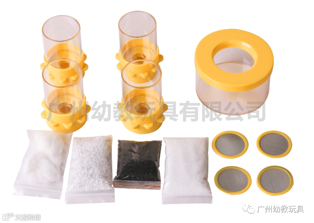 四种可拆卸配件组建而成(透明圆柱管*4个、不锈钢滤网*4个,莲花座连接件*4个,收集底座*1个) 功能:在过滤网上分别放石头、沙子,棉花、活性炭(材料自备)将污泥水倒入套件后观看水的净化过程,也可随意更改放置顺序观看哪种放置效果更佳。