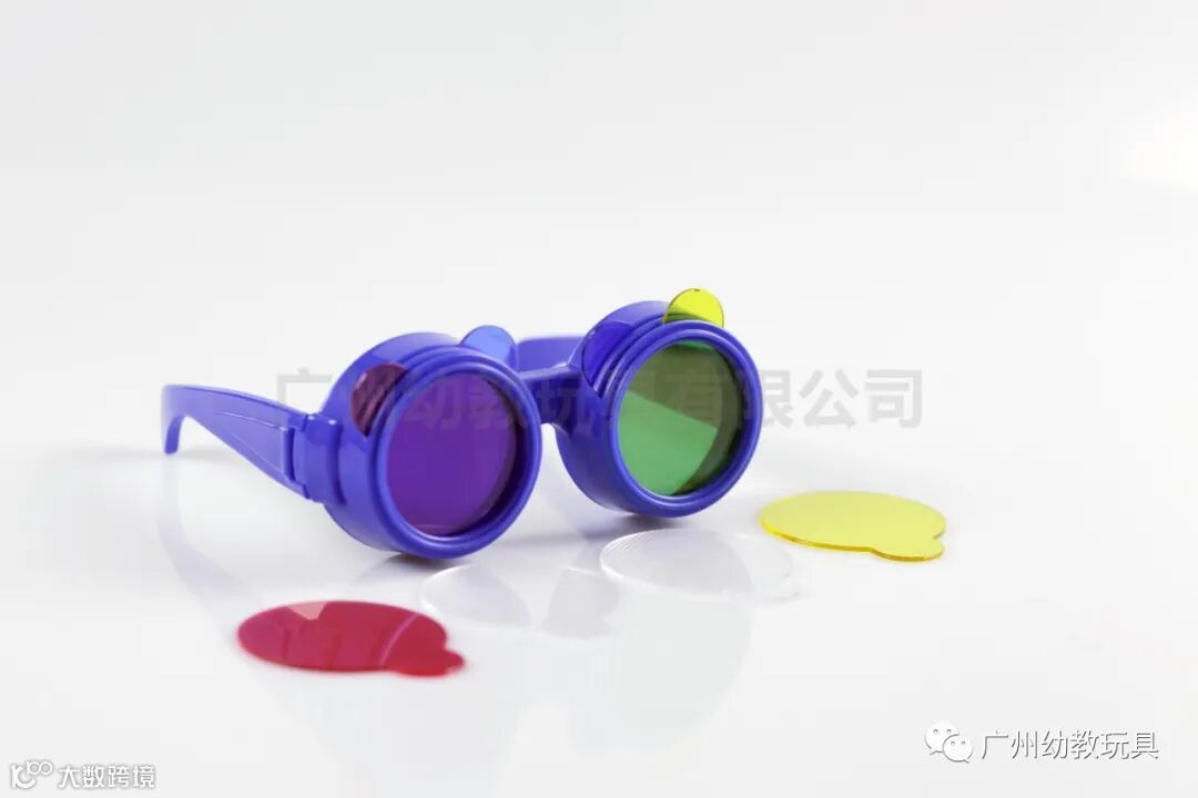 眼睛镜架上的4个插孔可任意插入不同颜色的镜片,观察2个镜片叠加后产生的不同色彩。