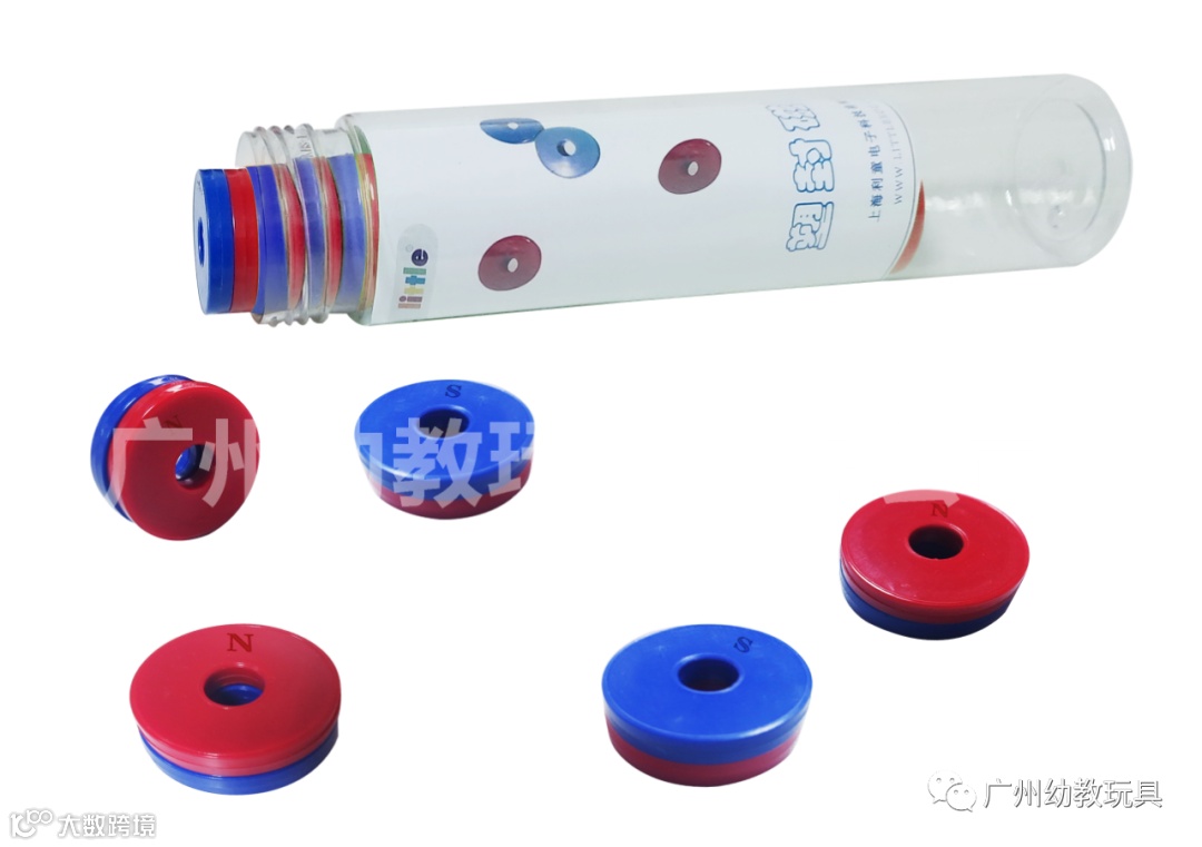 产品内置磁铁,外面塑料外壳包裹,一面蓝色代表“S”极 ,一面蓝色代表“N”极,安全美观,可供小朋友探究磁力大小 磁力方向、磁场和磁力的关系。