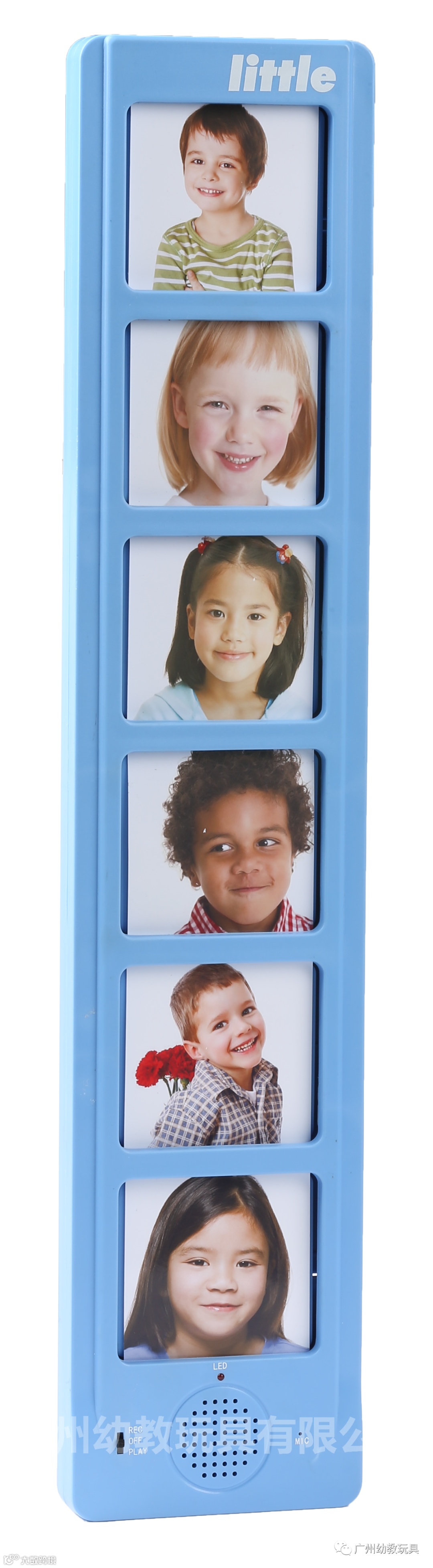 产品有6组70mm*80mm录音相框,侧面可更换照片,按压相框可录制或播放15秒语音,反复使用。用于小朋友,教师及园长自我介绍,动植物成长的过程,其他小故事等。背面有钥匙扣可挂于墙上。