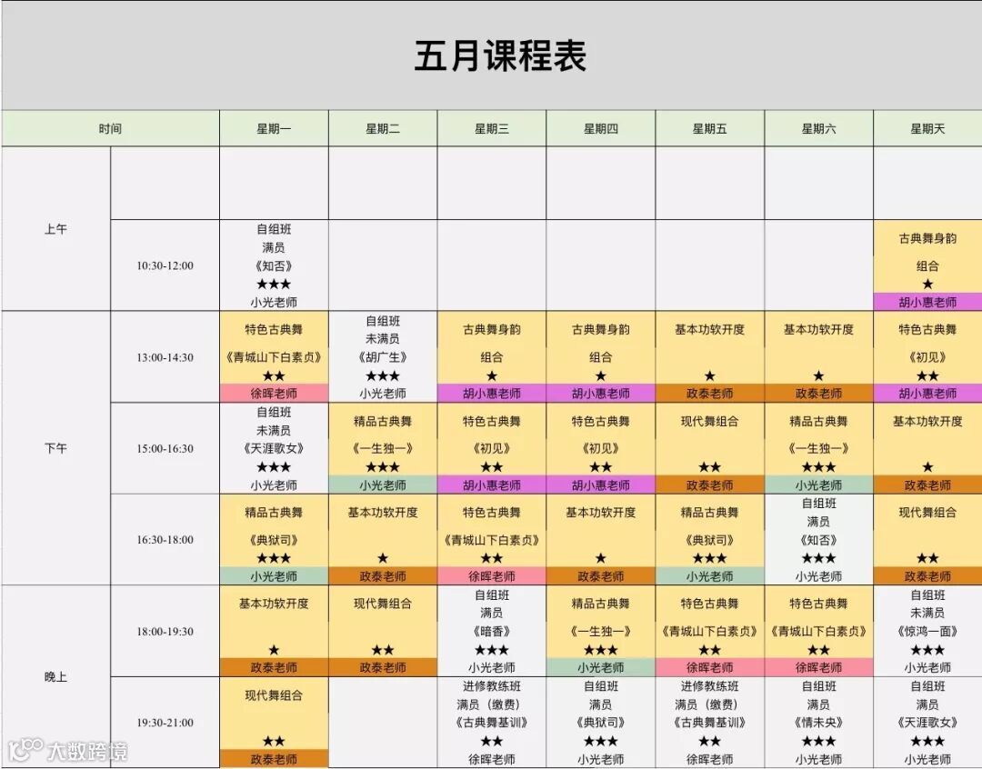 (周末舞蹈课程内容,重复学习周1至周5内容,黄色底色皆为常规课程,次卡学员均可按照课程表时间上课)