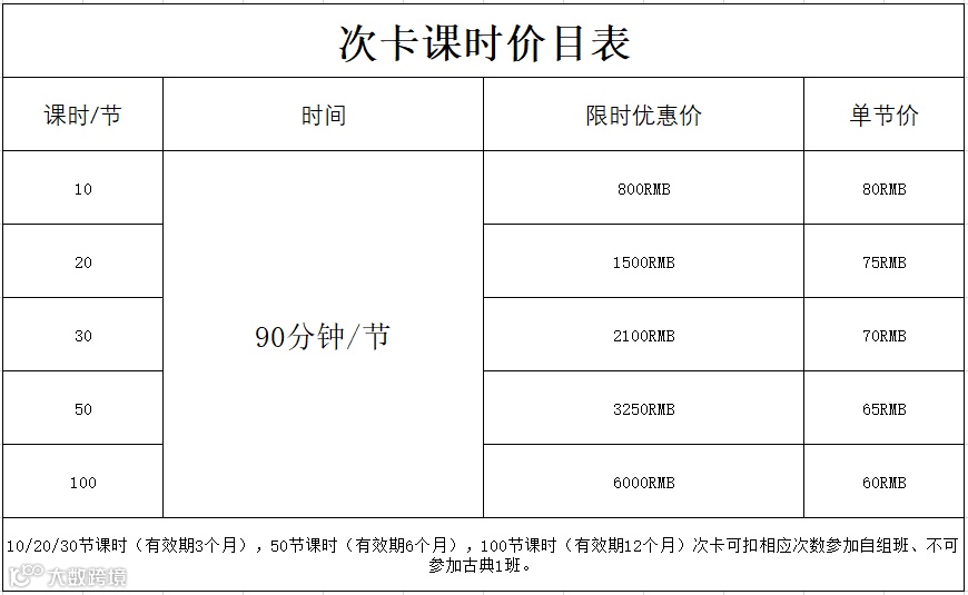 注:所有课程不退卡、不延期、