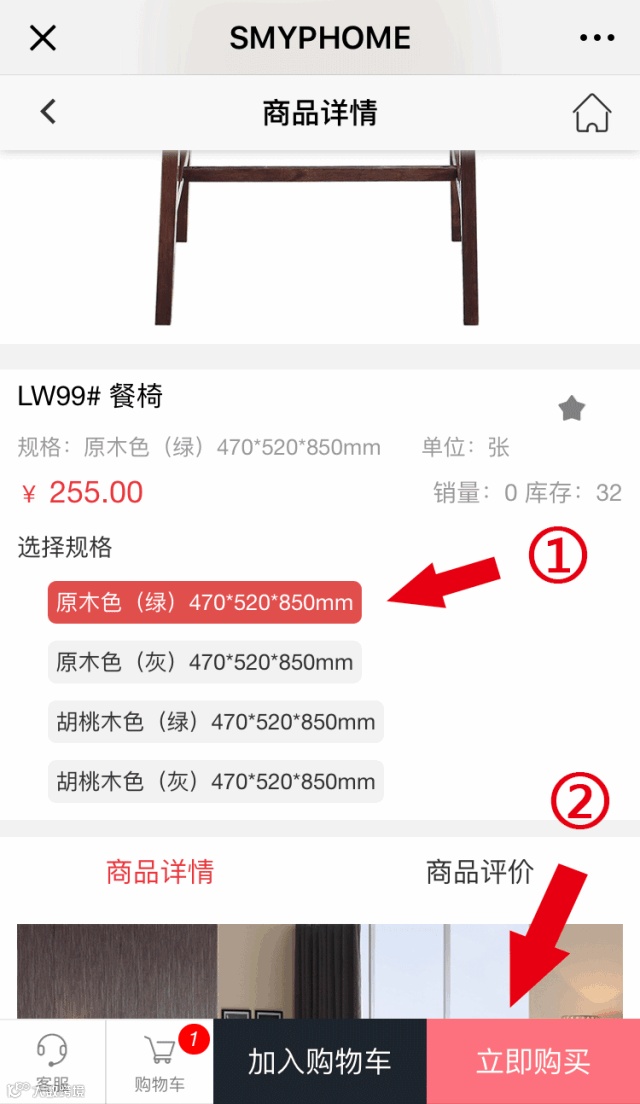 ②弹出页面,选择相应的产品规格,点击[立即购买] → ③选择[配送方式]、[配送门店]和[支付方式] → ④提交订单,完成支付,订单即可生成 → ⑤客人人员电话联系安排送货