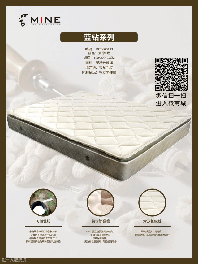 梦享Ⅱ号厚垫,采用泰国天然乳胶,3D透气双面网孔和独立筒弹簧;具有可拆水洗性。