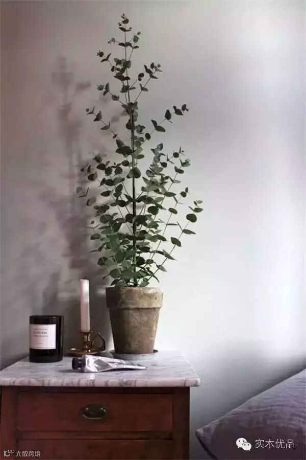 看到这款植物很是面熟,但又觉得名字如此陌生?但换个它常见的名字——桉树,是不是就恍然大悟了。没错,这个在各大家居博客中常出现的百搭摆件就是考拉最爱——桉树叶!除了叶片饱满,造型好看,随意摆放在玻璃瓶里都是一景之外;尤加利的清新气氛,也让人欲罢不能,还益于我们呼吸系统与免疫系统的调养,建议在家里常活动的地方都可以善加利用。