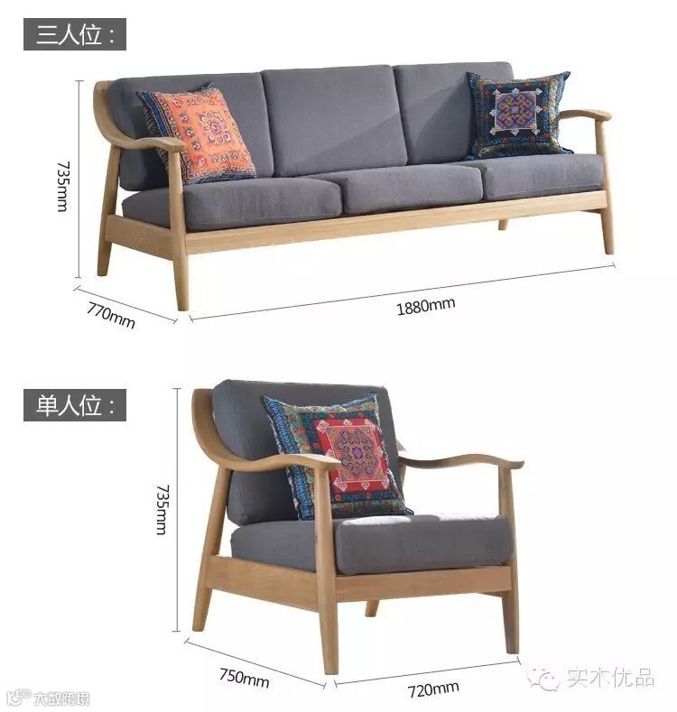 尺寸: ①单人沙发:720*750*735mm;②三人沙发:1880*770*735mm