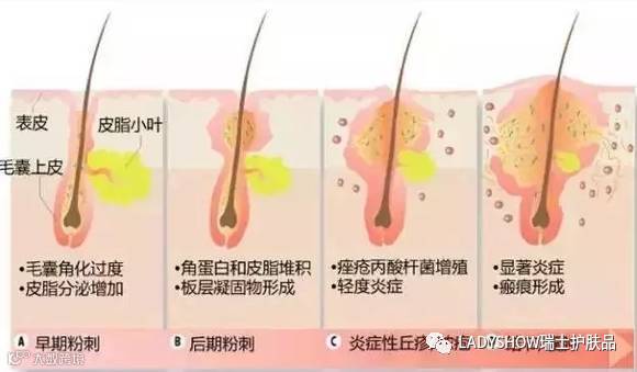 由于皮肤本身只能分泌油脂,而不能提供肌肤所需的水份,肌肤缺水导致水油不平衡,油脂分泌过多就会堵塞毛孔导致粉刺出现。因此需要外界为肌肤注入水份,保持肌肤表层水油平衡