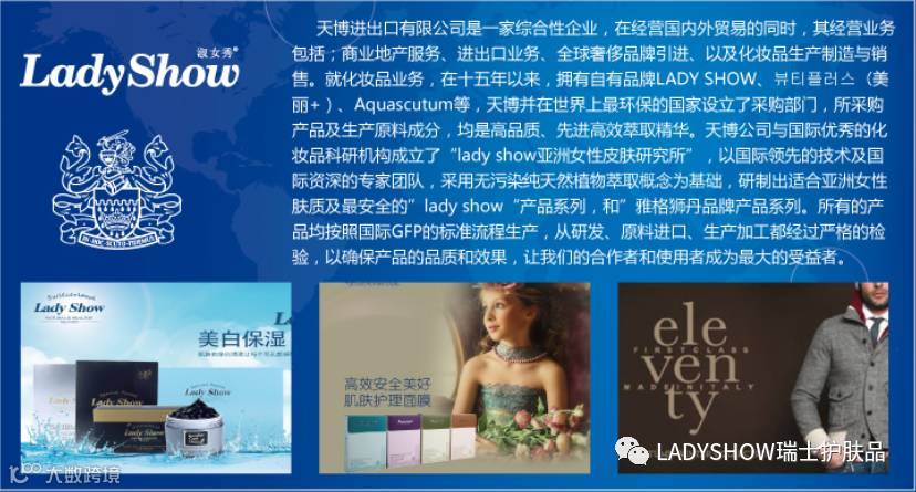 淑女秀品牌于源瑞士,并且在世界上最环保的国家瑞士,设立了采购部门及国际优秀的化妆品科研机构,成立了“lady show亚洲女性皮肤研究所”,以国际领先的技术及国际资深的专家团队,采用无污染纯天然植物萃取概念为基础,研制出适合亚洲女性肤质及最安全的”lady show“产品系列,和”雅格狮丹品牌产品系列。