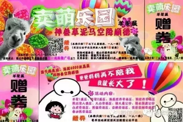 5月1日- 5月3日(展示时间9:00--21:30),以卖萌乐园为主题的羊驼展将在顺德大良新一城购物广场的正门举办为期3天。届时除了有三只来自南美洲的“草泥马”羊驼外,更有多达12个卖萌区域给您与家人合照见证萌哒哒的幸福时光,如海底世界造型卖萌区——各种海底动物正等待各位小朋友漫步海底世界卖萌区,“熊出没”人偶卖萌区——熊大、熊二邀你一起到熊出没卖萌区历险,还有呆萌的大象公仔与长颈鹿公仔给小孩骑着来卖萌等候各位的到来,一起放飞这个小长假;更有特大的大白毛绒公仔抱着来卖萌,让您感到温馨的呵护。让您带上您的小孩欢度一个精彩难忘的五一小长假吧!心动不如行动,带上您的单反照相机、高清照相机、手机为您的家人拍摄一本卖萌“写真集”吧!