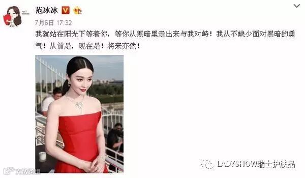 上周,范冰冰在微博上写到:我就站在阳光下等着你,等你从黑暗里走出来与我对峙!我从不缺少面对黑暗的勇气!从前是,现在是!将来亦然!