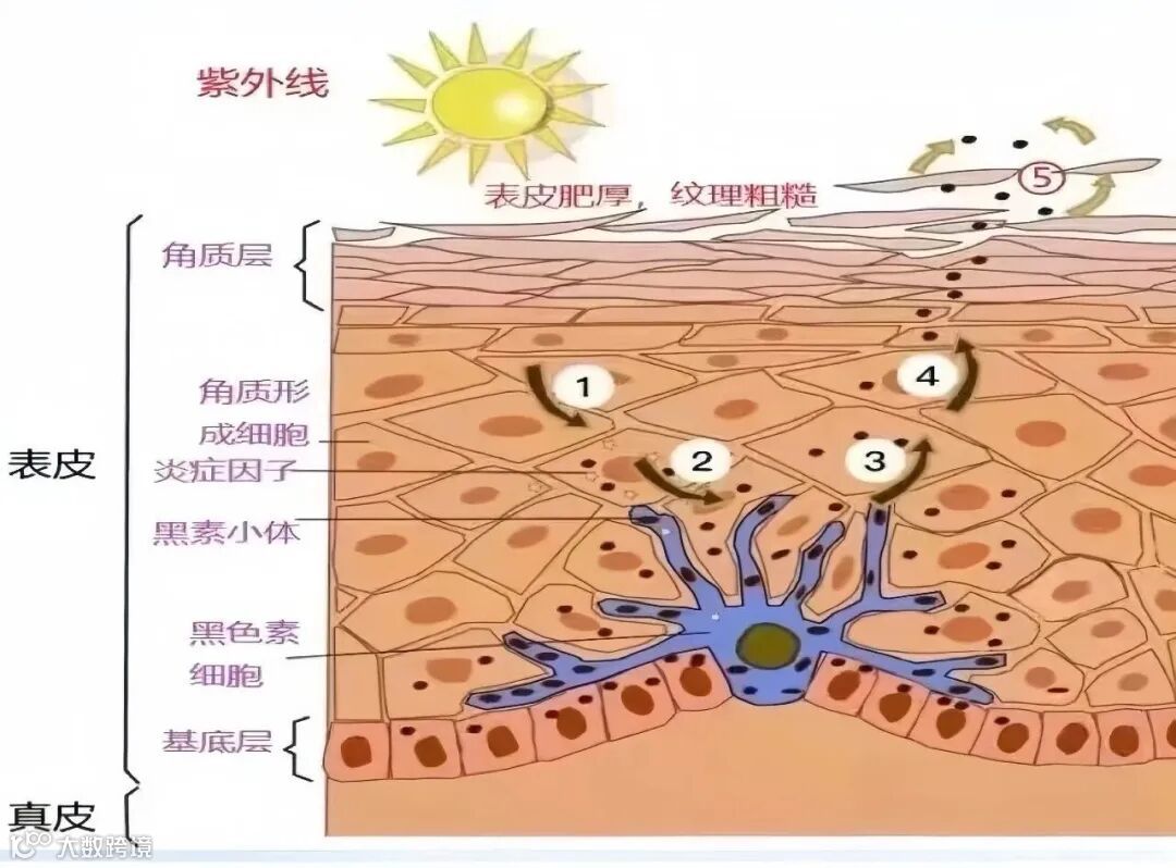 黑色素细胞位于表皮基底层,它会通过章鱼样的触角结构,与约36个角质形成细胞相连,合成的黑色素只有通过这些触角转运至角质形成细胞中,并随细胞分化移行到表皮全层,才能真正影响肤色。这一环节的干预核心,是阻断黑色素转运。