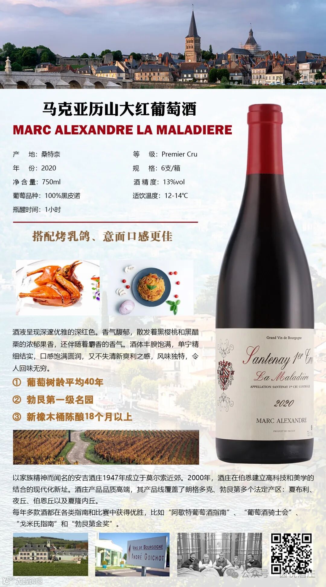 在桑特奈(Santenay)产区,有许多历史悠久的酒庄建筑, 这次为大家选的这款酒是以家族精神而闻名的安吉酒庄。成立时间1947年,酒庄产品品质高端,新橡木桶陈酿18个月以上,其产品线覆盖了朗格多克、勃艮第多个法定产区:夏布利、夜丘、伯恩丘以及夏隆内丘。每年多款酒在各类指南和比赛中获得优胜,比如“阿歇特葡萄酒指南”、“葡萄酒骑士会”、“戈米氏指南”和“勃艮第金奖”。