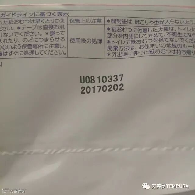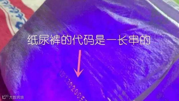 花王纸尿裤上有代码批号,这是流水线的生产编码,代表着生产的批次和渠道,位置随机,用紫外线灯可以照出来,这个是花王专有的技术。但并不是所有的包装上都会有,并且花王官方明确表示,防水印并不具备作为验证花王真伪的标准。