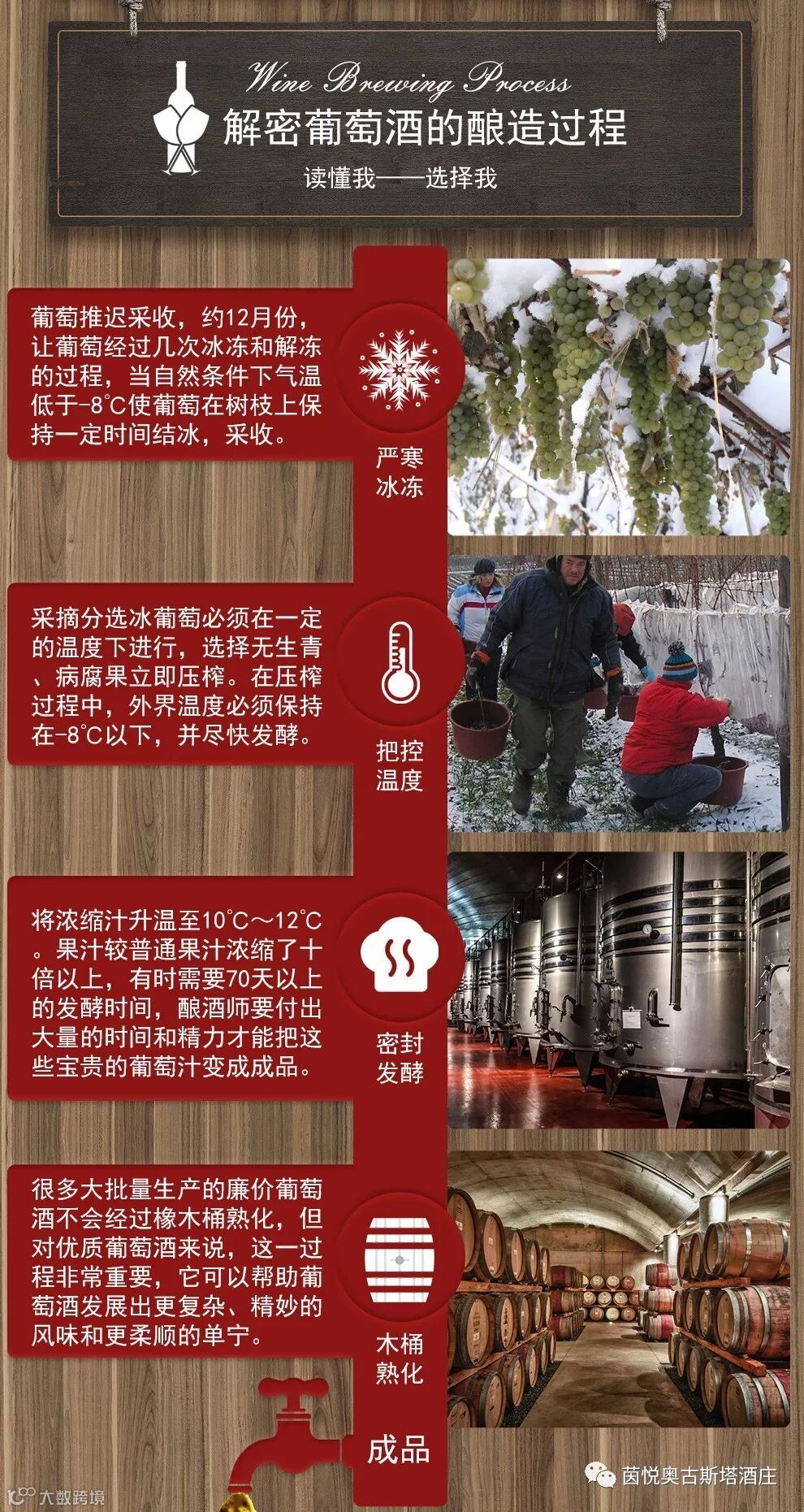 冰酒的酿造方式比较特别,带有冰晶的葡萄进入酿酒室后直接进入酿酒桶,然后经历非常非常缓慢的发酵,大约要2-6个月。酿造出的冰酒含糖量至少每升125克(干红含糖量为低于4g)。严禁人工加糖。