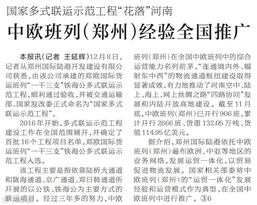 中欧班列(郑州)经验全国推广