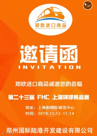 您好!郑州国际陆港公司将于2019年11月12日至11月14日携郑欧进口商品参加2019第二十三届 FHC 上海环球食品展, 展位号:N3D41 诚邀您共赴本次盛会。