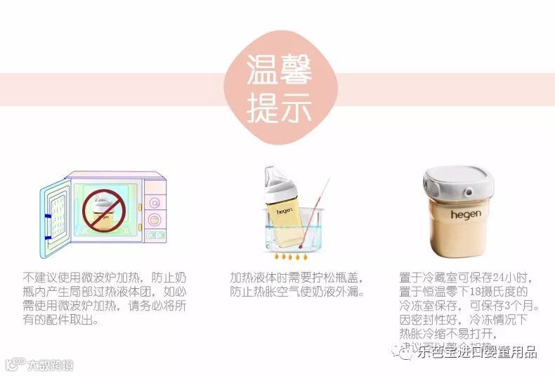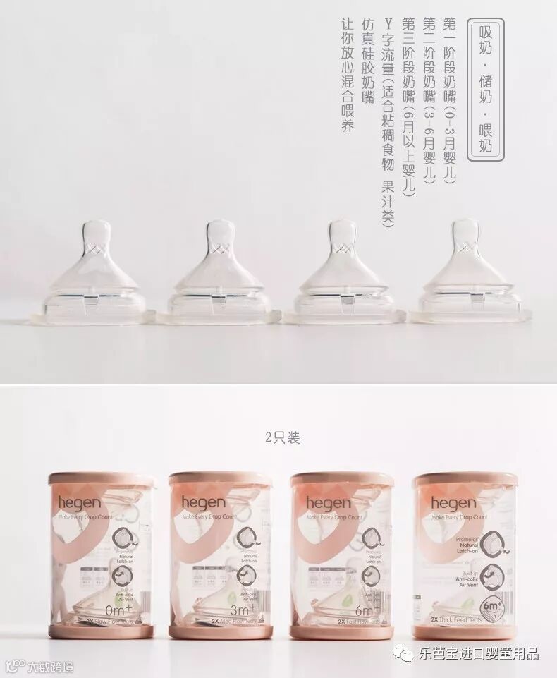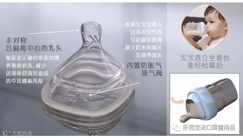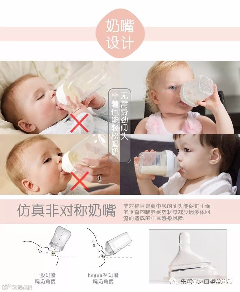 乐芭宝进口婴童用品跟它的智能释放奶嘴有无法分割的关系 偏中心设计,宝宝坐着也能轻松饮尽最后一滴奶!偏中心奶嘴设计和歪脖子奶瓶的功能相同,都能预防呛奶、防止压力对耳道造成冲击(耳道残留奶液容易诱发中耳炎),只是歪脖子奶瓶清洗不便 hegen奶嘴很棒的功能是在于“智能释放”,在宝宝含住奶嘴并进行适当挤压的时候(成人1指的按压力度),奶水就会自动流入口中! 奶嘴防胀气孔开在上方,喂哺过程中不会产生奶泡(求买了导管式防胀气奶瓶清洗者的阴影面积),空气直接进入瓶身,减少因奶泡而产生的氧化过程造成营养流失。