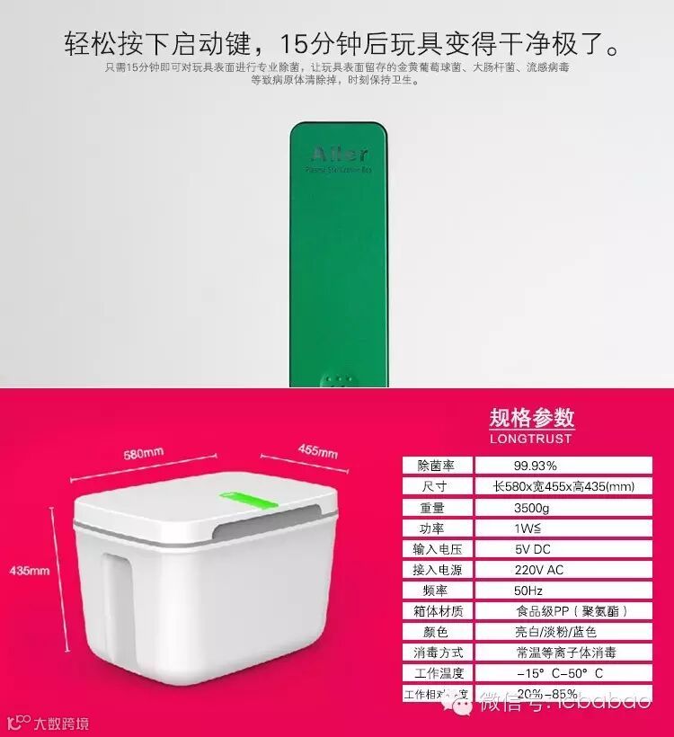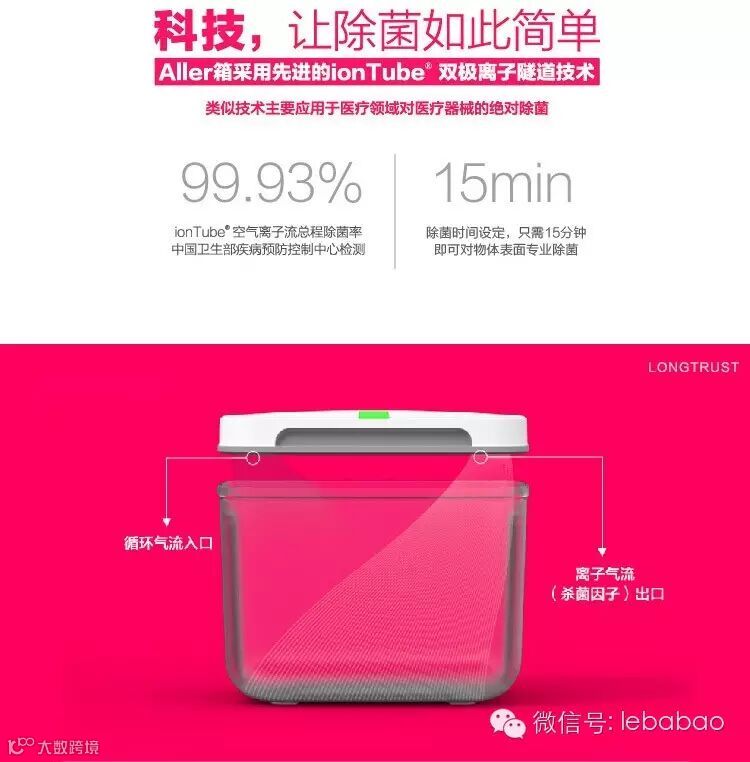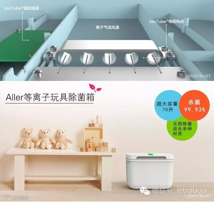 Aller等离子玩具除菌箱采用先进的ionTube双极离子隧道技术,类似技术主要应用于医疗领域,对医疗器械进行除菌杀毒。采用这项技术的产品除菌率高达99.93%,设定除菌时间,只需15分钟即可对玩具表面进行专业除菌,让玩具表面留存的金黄葡萄球菌、大肠杆菌、流感病毒等致病原体清除掉,时刻保持卫生。