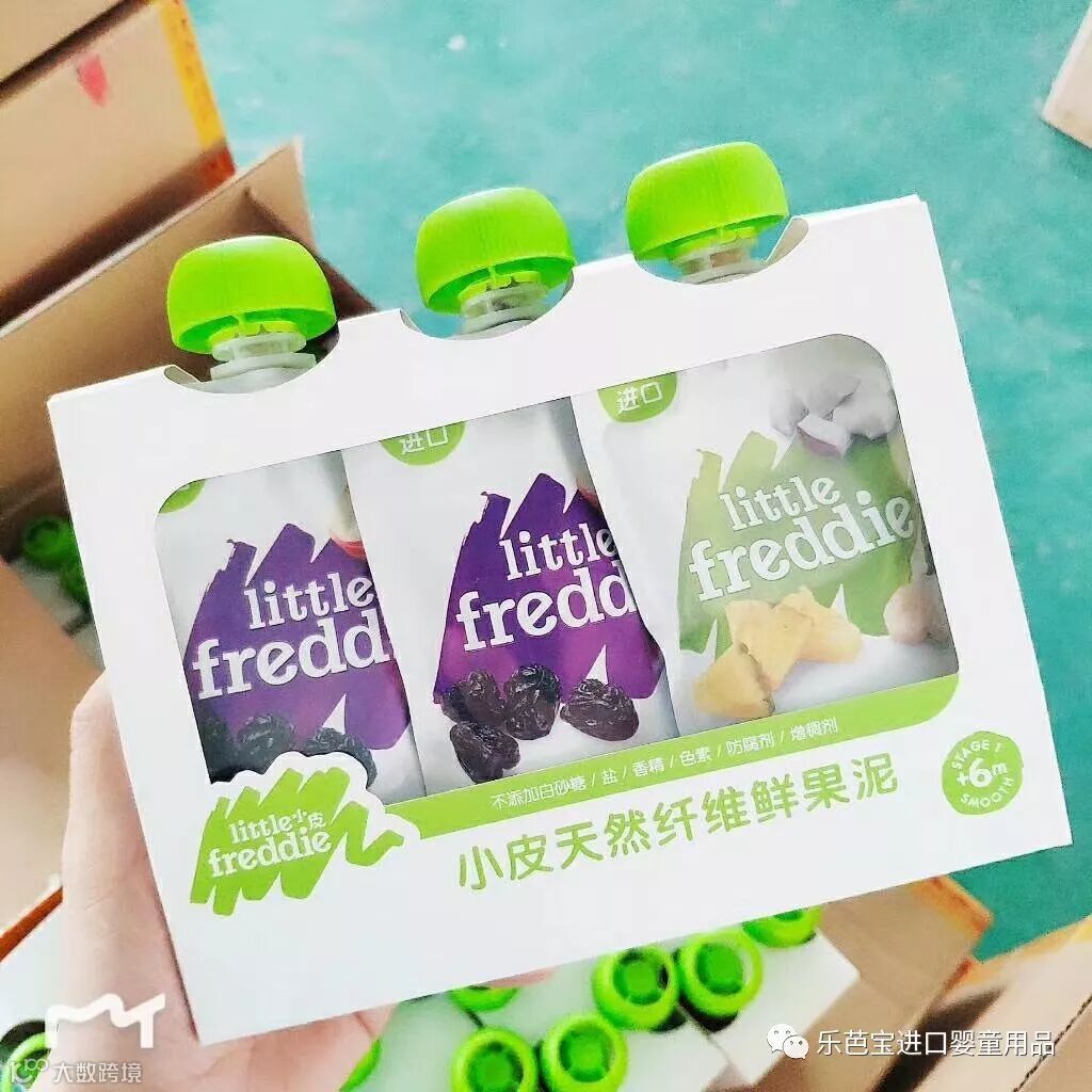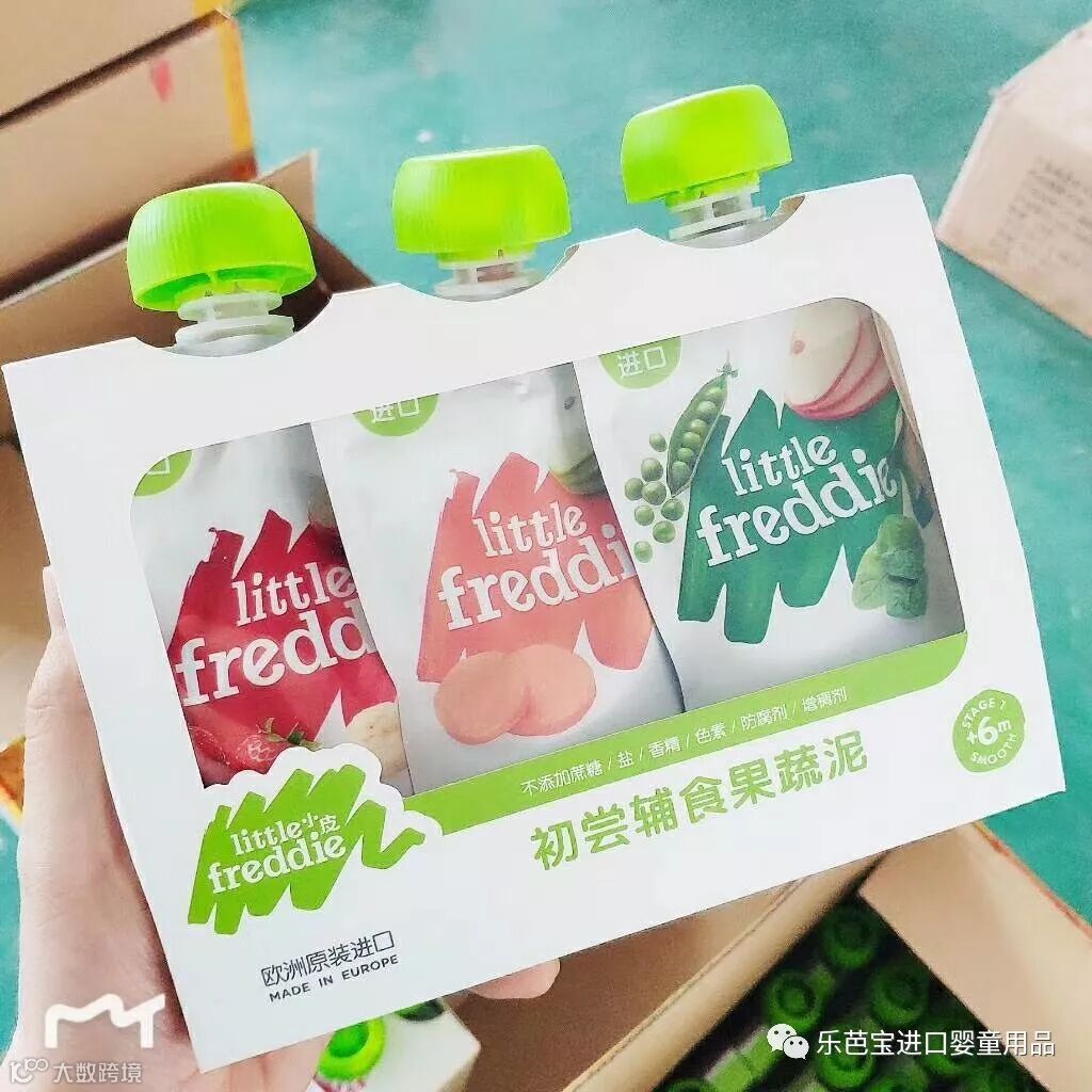 图2初尝辅食果蔬泥,内含香蕉草莓苹果泥一袋,胡萝卜苹果泥一袋,豌豆菠菜苹果泥一袋。