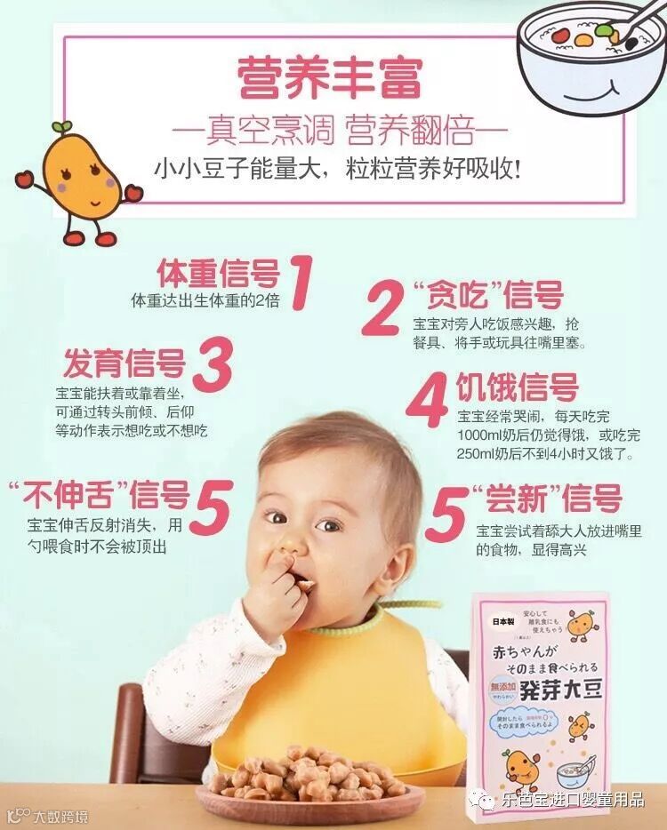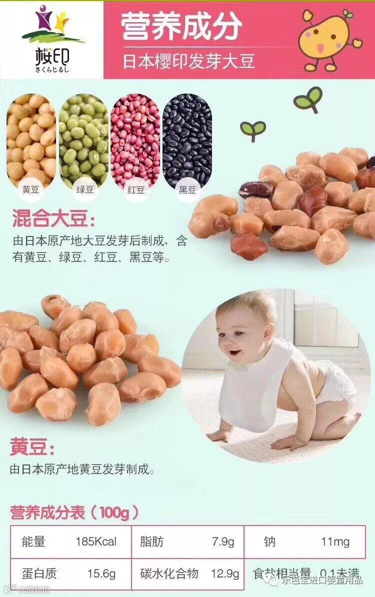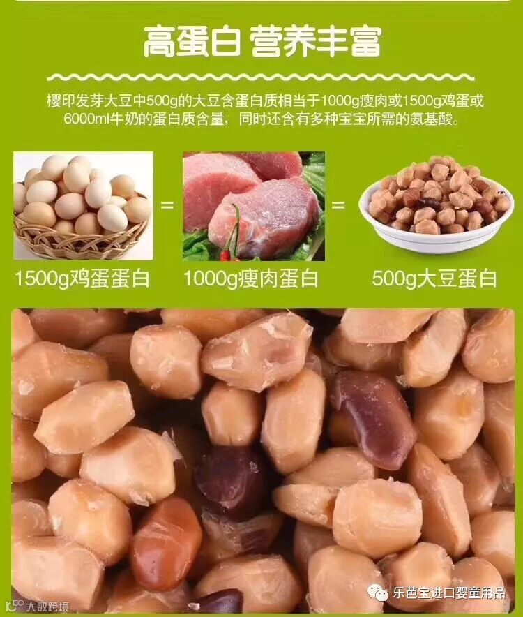 日本的美味发芽大豆,精选日本非转基因大豆,经12小时后发芽,隔水加压加热,保留全部营养素,口感绵软,易于宝宝咀嚼,发芽后蛋白质吸收率高达95%,日本政府都是采购这款发芽大豆给幼儿园和小学适合6个月以上婴幼儿,开袋可直接食用。