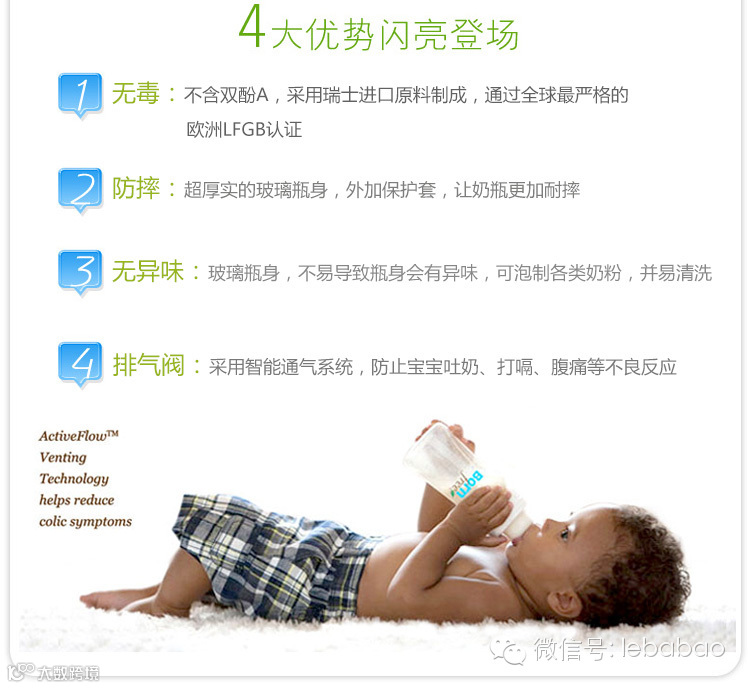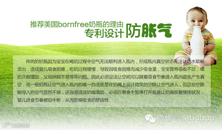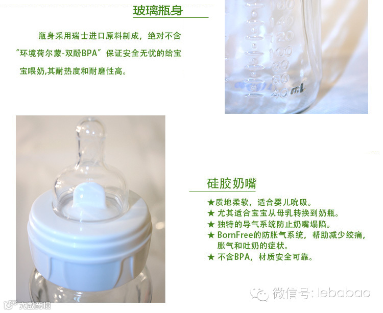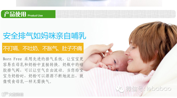 乐芭宝进口婴童用品材质安全,耐酸碱性、不含BPA!,独有循环导气防胀气系统,可帮助减少宝宝因吸入空气的肚子绞痛症状和预防中耳炎。Born Free是全球最早的不含BPA(双酚A)材质生产婴儿奶瓶的企业之一,公司即秉承世界的最高标准,为天下的宝宝提供最安全最好的婴儿喂养用品。
