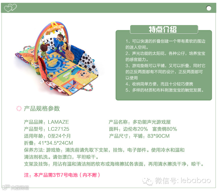 Lamaze拉玛泽游戏乐园婴儿游戏垫毯/爬行垫毯