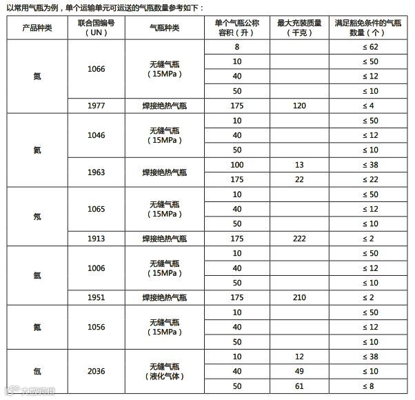 单个无缝气瓶公称容积不超过 50 升,每个运输单元所运输的压缩气体(氮气、氦气、氖气、氩气、氪气)气瓶总水容积不 超过 500 升;每个运输单元所运输的液化氙气净充装质量不超过 500 千克。 单个焊接绝热气瓶公称容积不大于 175 升,每个运输单元所运输的冷冻液化气体(氮、氦、氖、氩)净充装质量不超过 500 千克。