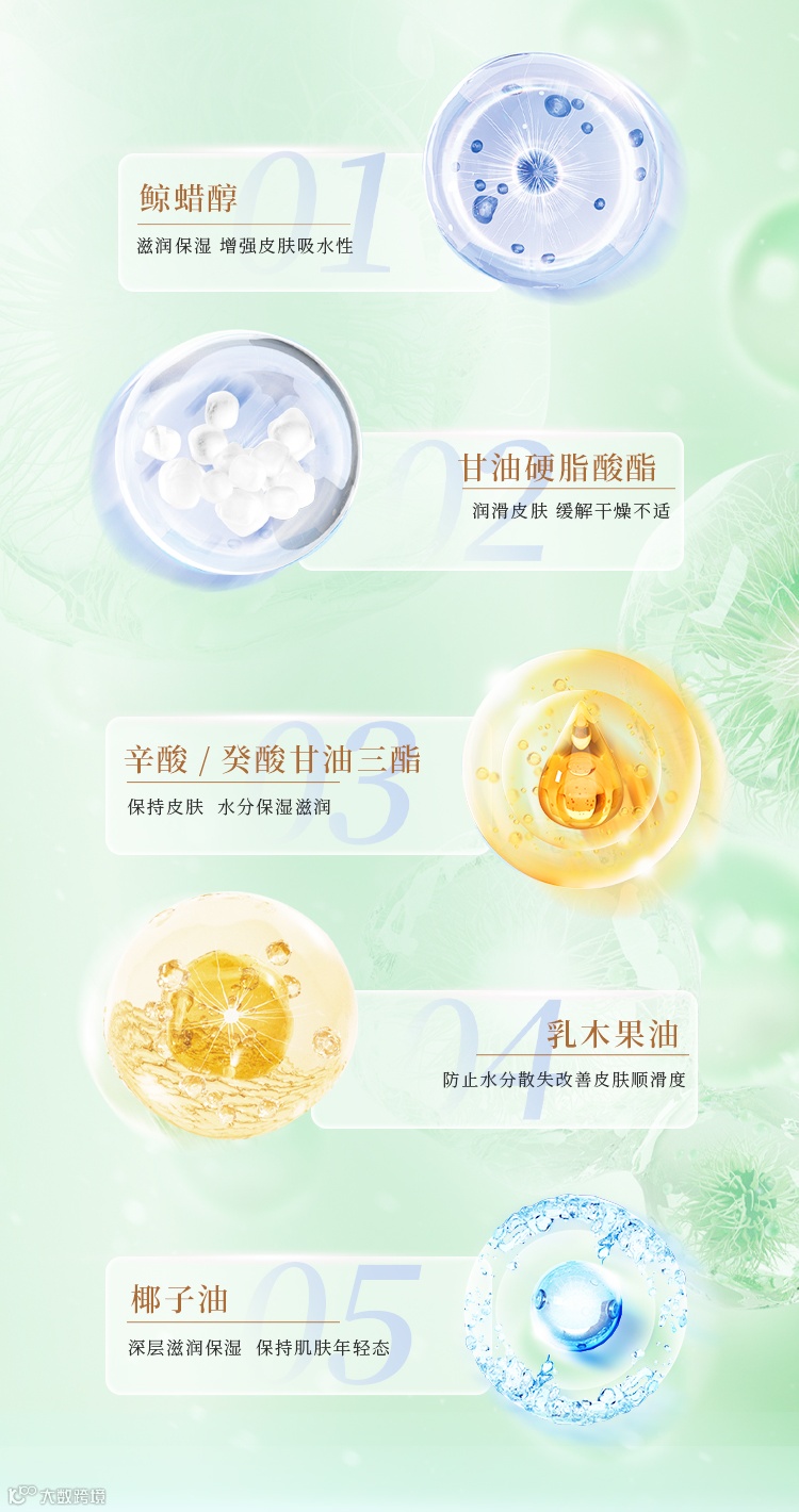 鲸蜡醇、甘油硬脂酸酯、辛酸/癸酸甘油三酯、乳木果油和椰子油等5种天然保湿油脂相辅相成,让你的肌肤感受到全面的滋润与柔滑。