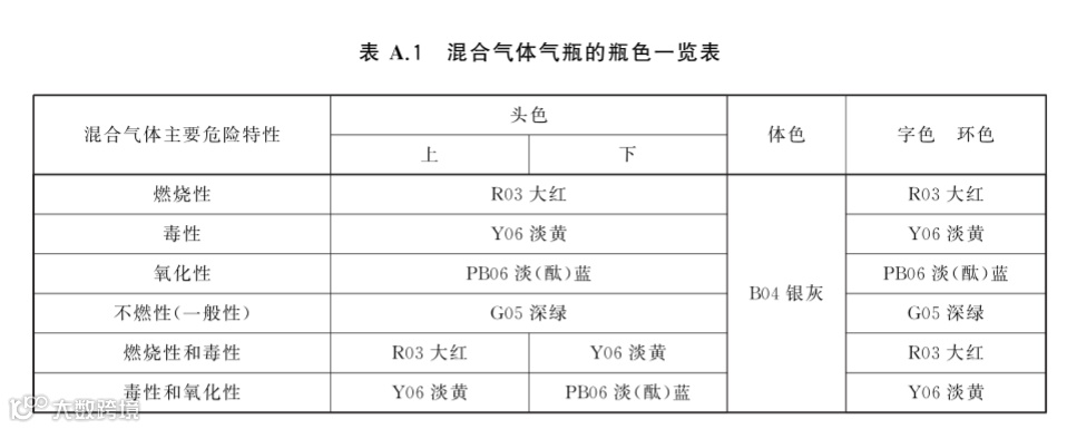 混合气瓶的瓶子颜色分为两部分:头部颜色和身体颜色。