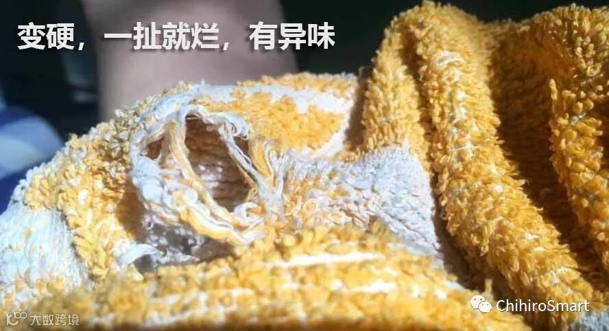 毛巾日常擦拭皮肤,容易囤积脂肪、污垢和水分,浴室环境潮湿更容易泛黄或产生异味;毛巾使用过久毛羽脱落只剩下骨杆,毛巾没有完全清洗干净导致纤维中残留污垢等会使毛巾变硬。
