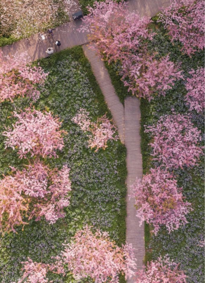 樱园春始,珞樱缤纷,晴川吹雪