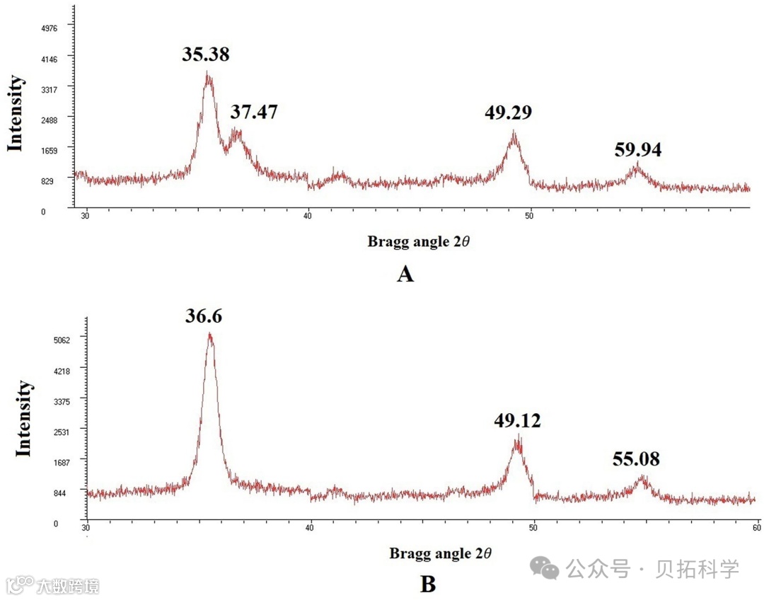 XRD测量用于表征纳米颗粒的独特晶体结构。在该研究中,XRD分析在2θ处发现了基于特定衍射峰的不同纳米颗粒。35.38°、37.47°、49.29°和59.94°的峰(图3A)代表CCNP的2θ值,而36.60°、49.12°和55.08°的独特峰(图3B)代表mAbCCNP的2θ值。在Maria Lazaridou等人的研究中,CS/TPP/DFO纳米粒子的2θ值在19.32°、21.03°、22.56°、23.98°和28.40°18处出现峰值。此外,在此研究中,CCNP在2θ=35.38°处观察到一个宽峰,而mAbCCNP在2θ=36.60°处观察到一个宽峰。由文献追踪,CS-Ag纳米复合材料的XRD结构在2θ值11.70°、19.80°、37.90°、44.00°和63.90°处显示出独特的峰型,表明壳聚糖和银的存在。综之,2θ值从35.38º变化到36.60°,49.29°变化到49.12°,59.94°变化到55.08°,表明由于利妥昔单抗附着在CCNP表面,CCNP的构象发生了变化。