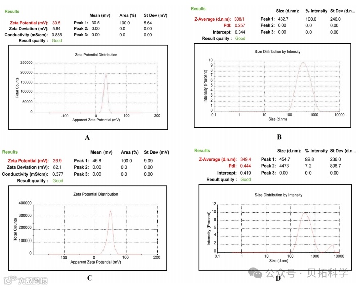 Muhammad H. Sultan等人,通过动态光散射原理分析所制备的纳米药剂粒径分布与ZETA电位分析,结果表明样品ZETA电位测试值为+50.4 mV,表明凝胶具有高阳离子性和稳定性,粒径尺寸分布也十分集中,表明样品制备尺寸稳定性。