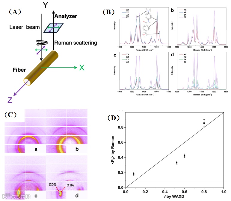 图1. (A)利用偏振拉曼光谱定量分析聚对苯二甲酰胺(PPTA)纤维中分子取向的实验装置示意图;(B)中(a)纤维-1、(b)纤维-2、(c)纤维-3 和(d)纤维- 4 在1000−1800cm−1光谱范围内的偏振拉曼光谱; (C)中(a)纤维-1、(b)纤维-2、(c)纤维-3 和(d)纤维-4 的广角 X 射线衍射(WAXD)图案;(D)偏振拉曼光谱法与广角 X 射线衍射法(WAXD)测定的聚对苯二甲酰胺(PPTA)纤维取向度对比