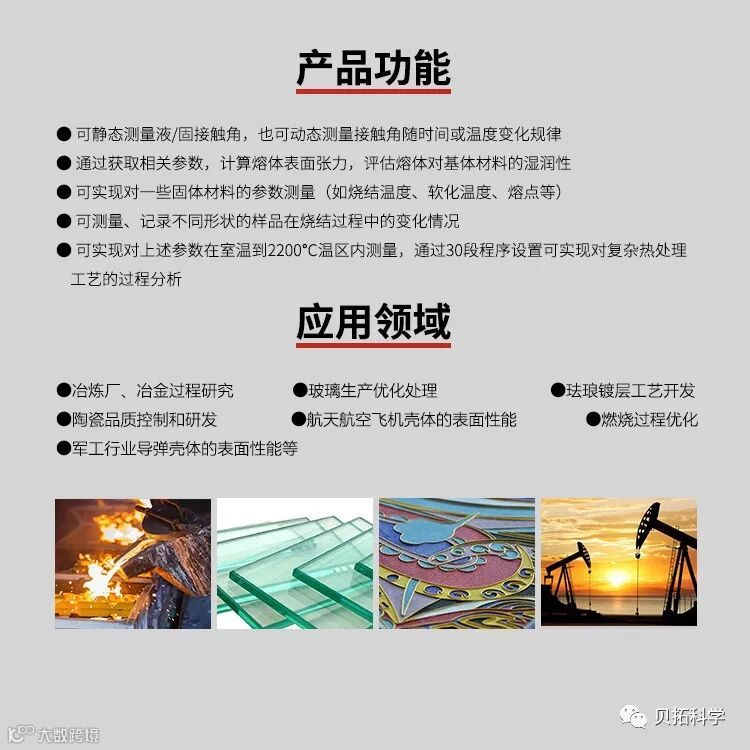 高温接触角应用也很广泛,应用在冶炼厂、冶金过程研究、玻璃生产优化处理、珐琅镀层工艺开发、陶瓷品质控制和研发、燃烧过程优化、航天航空飞机壳体的表面性能、军工行业导弹壳体的表面性能等